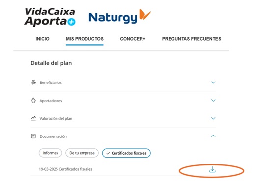 VidaCaixa pone a disposición de los partícipes el certificado fiscal del Plan de Pensiones de Empleo de Naturgy a través de la plataforma web y app para dispositivos móviles Aporta+.