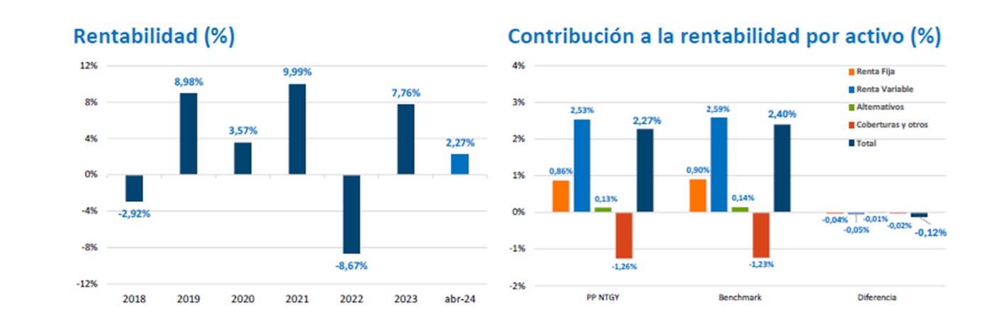 El Fondo de Pensiones se devalúa un 1,06% en abril y el índice de referencia un 1,09%. En el año, el fondo repunta un 2,27%, el índice de referencia un 2,40%.