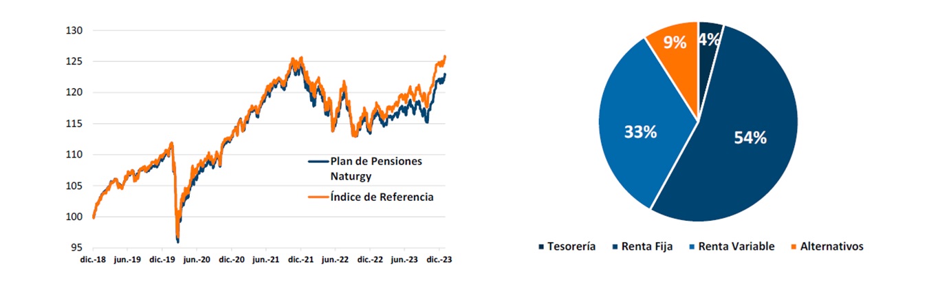 El Fondo de Pensiones presenta una distribución de activos en los que la Renta Fija representa la mayor parte de la cartera con un 53,9%, 0,9 puntos porcentuales por encima del índice de referencia. Esta asignación se divide en diferentes clases de activos, principalmente deuda pública y emisiones corporativas de buena calidad crediticia.