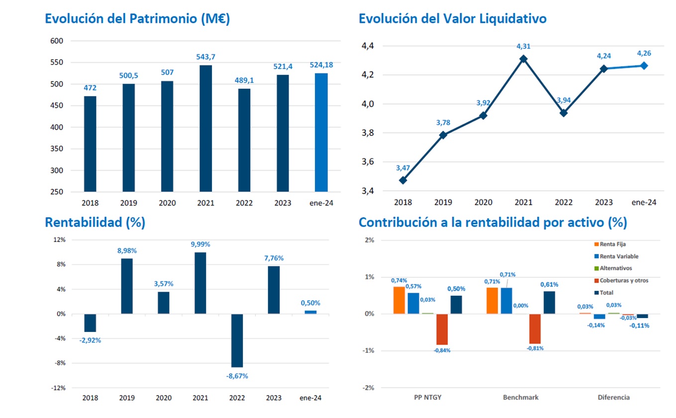 El Fondo de Pensiones crece un 0,5% en enero y el índice de referencia un 0,61% en el mismo mes. En el transcurso de este año, el fondo aumenta su valor liquidativo un 0,5% y el índice de referencia un 0,61%.