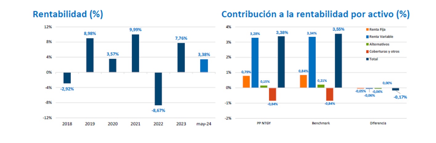 Las correcciones de los mercados financieros en abril (mes que nos recordó a 2022, ya que todo caía) han dado paso a una recuperación en mayo (estilo final de 2023: todo sube), y aunque las últimas sesiones del mes dejan un “mal sabor de boca”, se constata que el fondo del mercado sigue siendo comprador gracias a un entorno económico relativamente favorable (el PIB mundial avanza al 3,0%). Ahora bien, se debe seguir insistiendo en que persisten los mismos riesgos que meses atrás. Por un lado, que la inflación no termina de moderarse, al menos en EE. UU., y que va a costar reconducirla hasta el 2,0%, lo que condiciona los potenciales recortes de tipos de la Fed, que no llegarían hasta otoño. Y el riesgo está en que finalmente no rebaje, lo que anularía el margen de recortes del BCE más allá de la que se aplicará el 6 de junio. El otro gran riesgo lo observamos en los mercados bursátiles en los que el impulso alcista que podría dar una tasa de crecimiento de los beneficios del orden del 8% más que se compensa por unos ratios de valoración que se sitúan por encima de la media histórica. El arranque del año en las bolsas está siendo mucho mejor de lo esperado, lo que sin duda va contra el potencial de revalorización en los próximos meses. Todo lo contrario, se puede decir de la renta fija, que muestra un decepcionante retorno, al menos en la deuda pública con una duración por encima de los 2 años (de hecho, sufre pérdidas de entre el 0,5% y el 2,0%). La “parte buena” es que, a mayor TIR, más rentabilidad se puede esperar para los próximos 12 meses, cuando la potencial ausencia de revalorización adicional en las bolsas puede encontrar alternativa en la renta fija. Así, las carteras mixtas (en especial, las más defensivas) pueden seguir revalorizándose y batir la inflación. Esta noticia positiva en la renta fija y su rentabilidad potencial se acompaña de otra vinculada a China y a las noticias sobre las medidas adicionales, y más contundentes, que va a tomar para tratar de mitigar (ojalá sea “resolver”) los problemas de su mercado inmobiliario. Un complemento perfecto sería volver a apoyar su mercado bursátil que, como se ha constatado en los últimos años, es clave para empujar la economía. Ojalá las autoridades económicas del país se den cuenta y, con ello, veamos alzas en el segundo mayor mercado bursátil del mundo por capitalización.